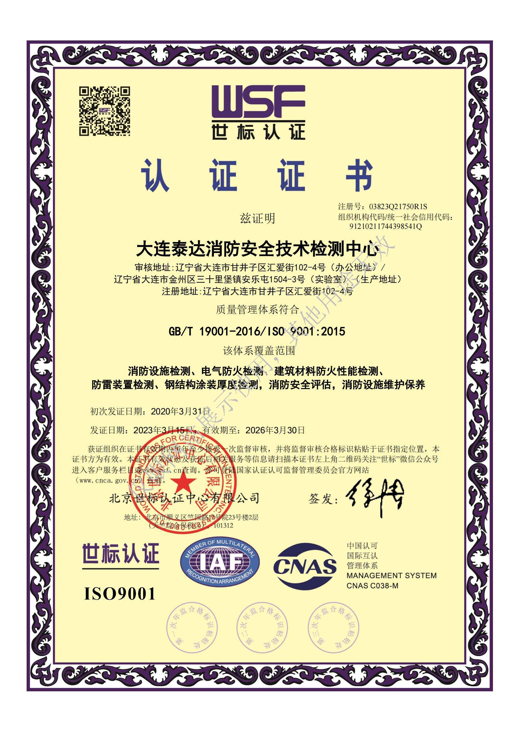 大連泰達消防安全技術檢測中心成立于2003年3月,2004年通過遼寧省質量技術監督局資質認定,成為大連地區首批取得計量認證資質證書的消防檢測機構;